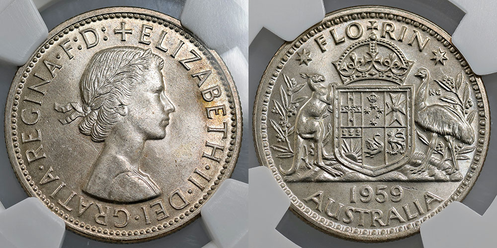 1959. NGC graded MS 63 (2614553-208), Obverse 6, Reverse B type. Ex Benchmark collection. Light tone with mint bloom.