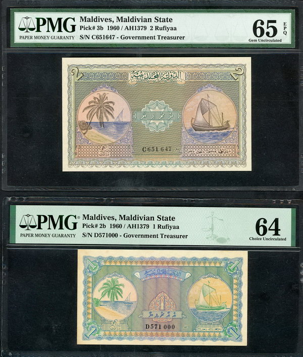 | Description: Maldives 1 Rufiyaa and 2 Rufiyaa 1960 (P 2b), (P 3b). PMG graded 64 Choice Unc and 65 EPQ Gem Unc respectively (8082651-046, 7054432-005). Government Treasurer. Some marks to first note. (2 notes total). |
