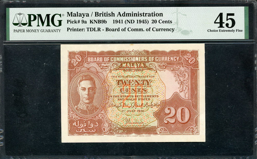 | Description: Malaya (British) Board of Commissioners of Currency 20 Cents 1-7-1941 (P 9a). PMG graded 45 Choice EF (8081992-040). By Thomas De La Rue, this small-change note was not issued until after the British had returned to Malaya and accepted the surrender of the Japanese. Slight mark at top. |
