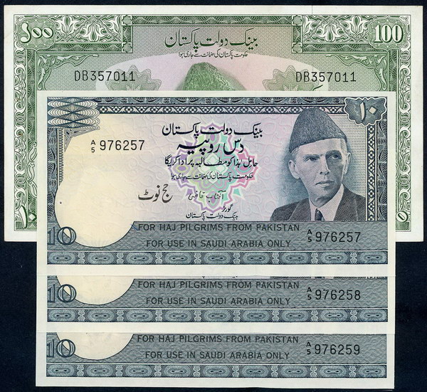 | Description: Pakistan State Bank 10 Rupees N/D (1970) (P R6). Haj Pilgrim overprint consecutive trio. Staple holes as issued, two light folds and handling. Also Pakistan 100 Rupees N/D (1957-61) (P 18a) without overprint. A few folds, rusty staple holes. (4 notes total). gVF-aUNC |