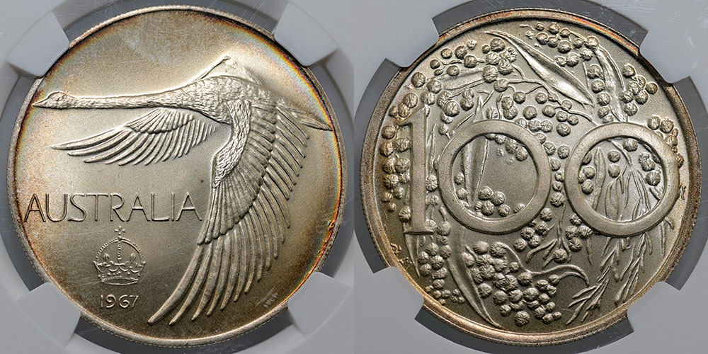 | Description: 1967 Pattern Swan Dollar, silver Unc, reeded edge. NGC graded MS 66 (2910804-002). Golden peripheral tone with mint bloom. GEM UNC |
