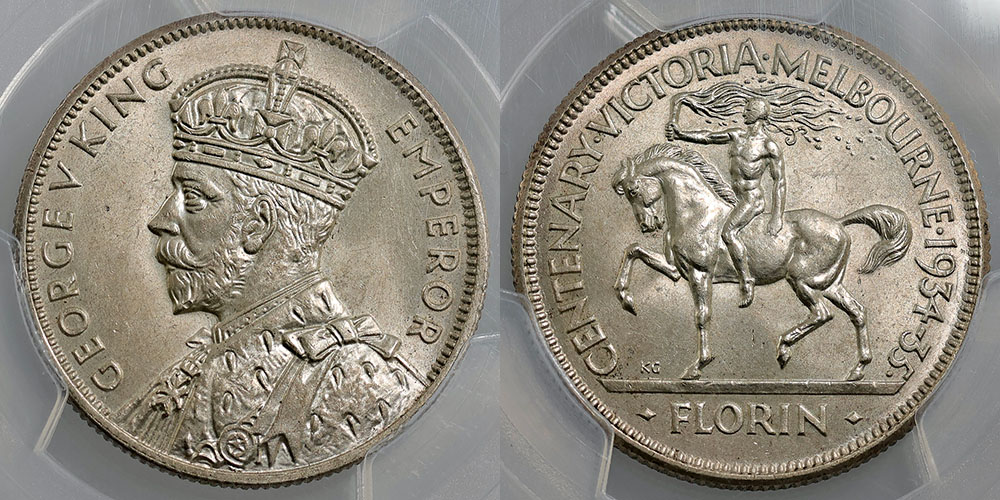 | Description: 1934/35 Melbourne Centenary. PCGS graded MS 65 (49070285). Later strike with rounded head of rider. Light tone with some bloom. GEM UNC |