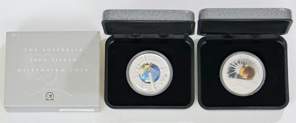 | Description: 2000/01 Millennium coloured 1oz silver Proofs; 2000 Sun, Earth, Moon and 2001 Cleopatras Needle. In packs of issue with COA, the first missing outer slipcase. (2 items total). FDC |