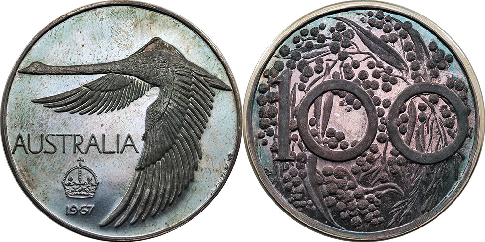 | Description: 1967 Pattern Swan Dollar, plain edge silver Proof. Old dark patina with blue/lilac colouring, a few minor marks. With original case (minor marks). Scarce. FDC |