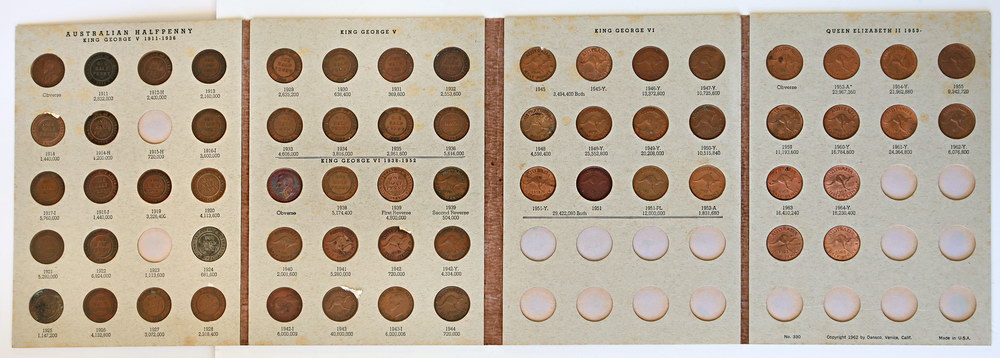 Halfpenny set 1911-1964, missing 1915H and 1923. In Dansco press-in album. A couple damaged. (62 coins total).