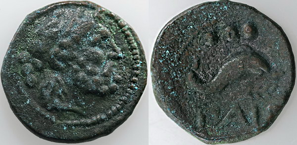 | Description: Ancient Greece Magna Graecia, Lucania (Paestum) under Roman Republic rule copper Quadrans N/D (circa 218-201 BC) (17mm). Obv: Head of Poseidon right, mark of value to left, Rev: Dolphin swims right, mark of value above -?AIS- below. HN Italy 1206. Bold with green patina and historically interesting. Good condition for type and scarce. aVF |