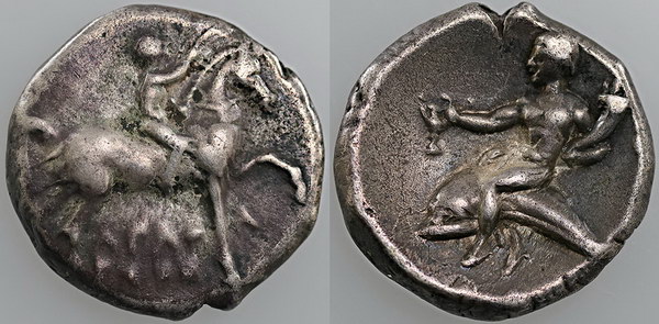 | Description: Ancient Greece Magna Graecia, Calabria (Tarentum), under Roman Republic rule, silver Nomos N/D (circa 272-235 BC) (6.21g, 19mm). Obv: Nude youth on horseback advancing right, placing wreath on horses head, inscription below, Rev: Taras atop dolphin left, holding kantharos aloft in right hand and resting cornucopia in left arm, torch to right. Weak Obverse strike, Reverse well struck, well centred and toned and a nice example. VF |