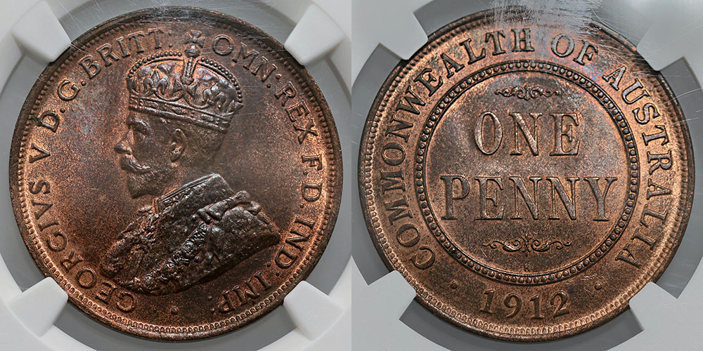 | Description: 1912H. NGC graded MS 65 RB (4331192-001). Attractive mint red and brown lustre. GEM UNC |