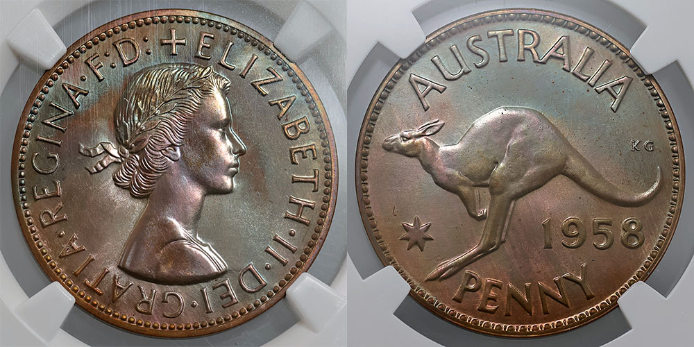1958 Proof Penny. NGC graded PF 66 BN (2610077-007). Matte brown with some iridescent lustre.