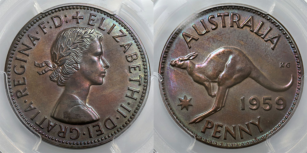 1959 Proof Penny. PCGS graded PR 64 BN (29713172). Dark toned with some iridescent lustre.