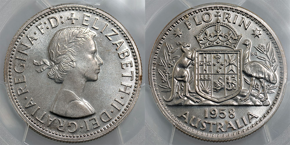 1958 Proof Florin. PCGS graded PR 66 (33220261). Light wash of tone.