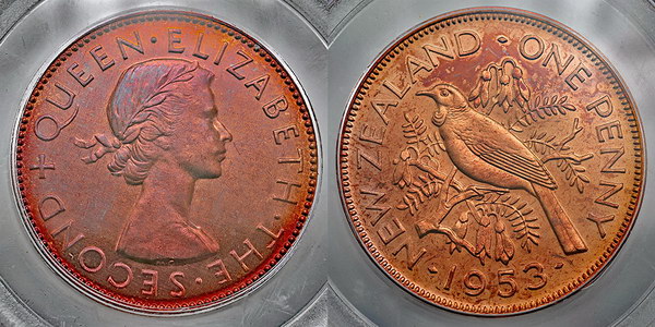 New Zealand 1953 Proof Penny. PCGS graded PR 65 RD CAM (16597251). Only one graded higher. Mint red, Obverse dark red with some blue lustre.