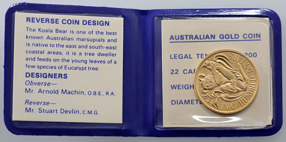 | Description: 1983 Koala gold Unc 200 Dollar (10g/22ct). In vinyl RAM pack of issue. UNC |
