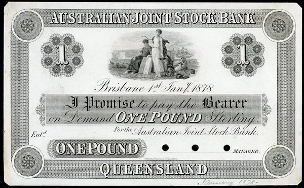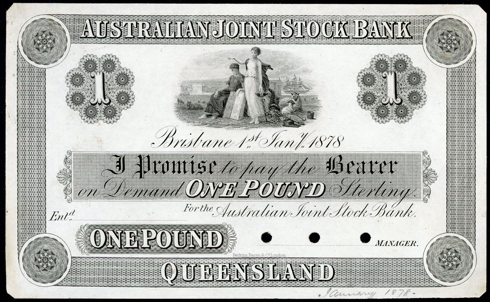 | Description: 1878 Australian Joint Stock Bank 1 Pound Printers Proof, Brisbane Qld 1-1-1878 (MVR 3aii). Single-sided black and white Printers Proof on plain thin paper, holed thrice over Managers signature panel and corners minimally cut to cancel. With pencil notations in bottom margin -January 1878-. By Perkins, Bacon and Co London. With tag as sold previously for $26,000. aUNC |