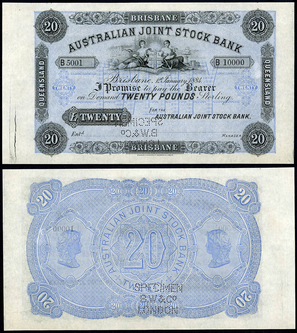 | Description: 1884 Australian Joint Stock Bank 20 Pound specimen, Brisbane Qld 1-1-1884. Double-sided colour (blue) specimen on plain thin paper, perforated SPECIMEN - BW AND CO - LONDON in retrograde over signature panel. Ink roller mark to left, a little wavy. By Bradbury, Wilkinson and Co Engravers, London. With tag as sold previously for $23,000. Very rare. aUNC |