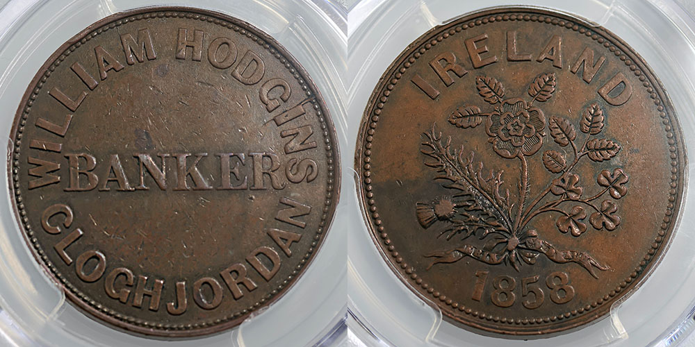 | Description: Hodgins, William Cloghjordan Ireland 1858 copper Penny token (R239/A659). PCGS graded AU 55 (58628524). Rarity 3. The only example graded by PCGS and scarce as such. Despite being associated with Ireland, these tokens were produced exclusively for use in Australia and New Zealand. gEF |