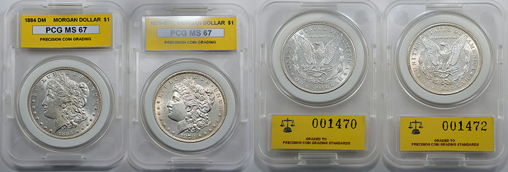 United States silver Morgan Dollars 1879 S, 1884 DM. Both PCG (Precision Coin Grading) graded MS 67. Minor marks, some bloom. (2 coins total).