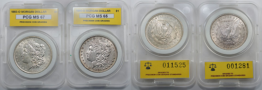 | Description: United States silver Morgan Dollars 1880 O, 1883 O. PCG (Precision Coin Grading) graded MS 65 and 67 respectively. Light tone with some marks, case of latter cracked. (2 coins total). Ch.UNC |