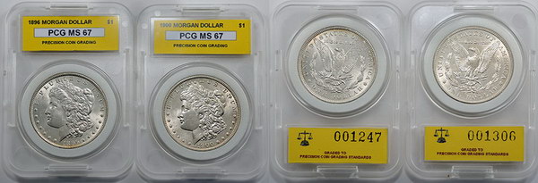 United States silver Morgan Dollars 1896, 1900. Both PCG (Precision Coin Grading) graded MS 67. Some marks, light tone. (2 coins total).