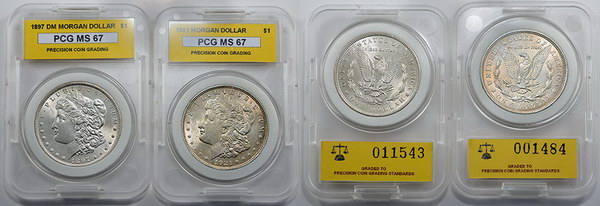 United States silver Morgan Dollars 1897 DM, 1921. Both PCG (Precision Coin Grading) graded MS 67. Some marks, latter lightly toned. (2 coins total).