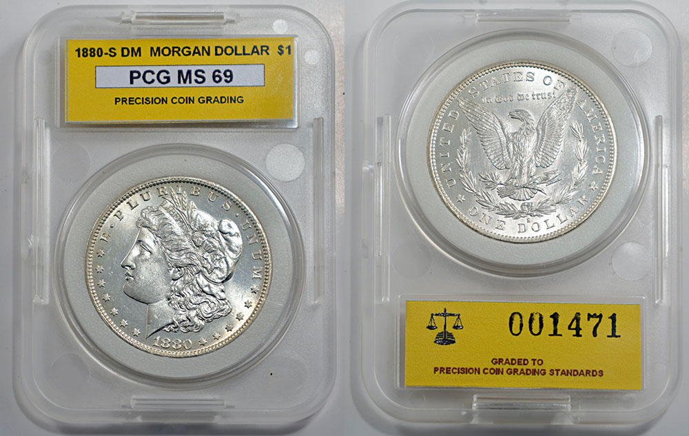 United States silver Morgan Dollar 1880 S. PCG (Precision Coin Grading) graded MS 69. Bright bloom.