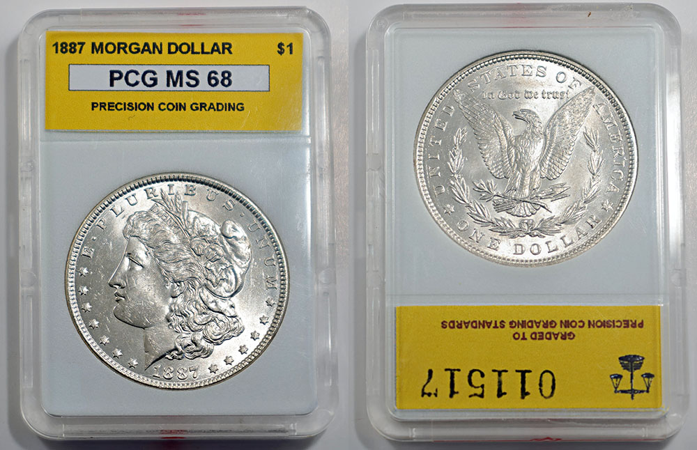 United States silver Morgan Dollar 1887. PCG (Precision Coin Grading) graded MS 68. Some bloom.