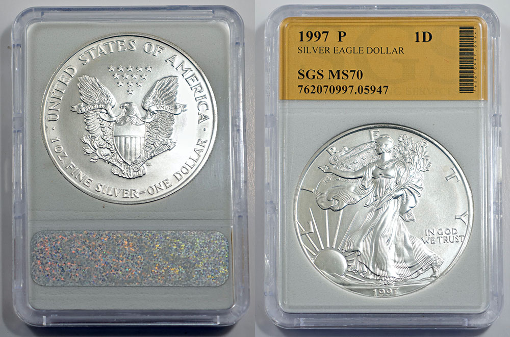 United States 1 oz silver Eagle Dollar 1997 P. SGS graded MS 70.
