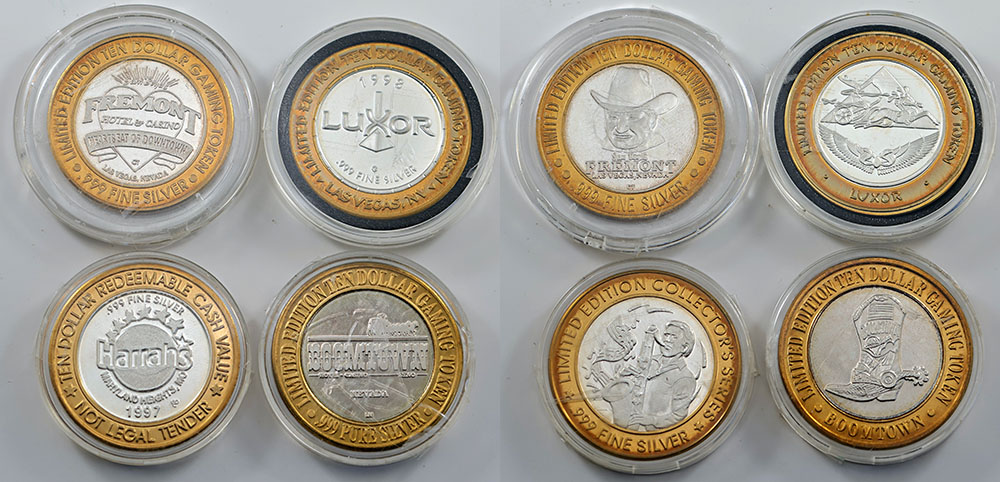 | Description: United States Collectors Series Silver Strike $10 tokens (37.44g/ 43mm); Luxor 1998, Fremont, Harrahs 1997 and Boomtown. Struck in .999 fine silver with selective gold plate, these tokens were awarded as prizes on slot machines. In capsules (a little sticky). (4 items total). As Struck |