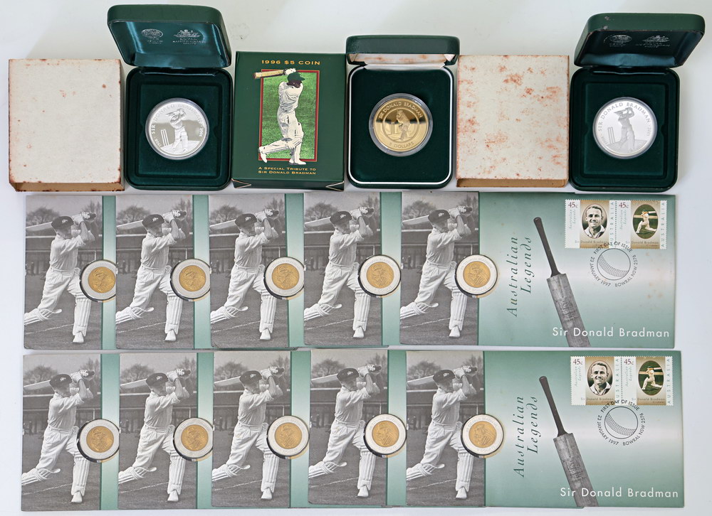 | Description: 2001 Sir Don Bradman silver Proof $5 (2), 1996 al/br Proof $5 and 1997 PNC 5 Dollar issues (10). In boxes/packs of issue (some marks/damage). (13 items total). UNC-FDC |
