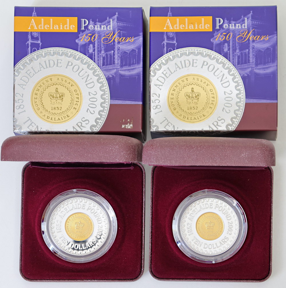 | Description: 2002 Adelaide Pound 150 Years selectively gold-plated $10 silver Proof. In boxes of issue with COA (some environmental damage to cases, one box taped). (2 items total). FDC |