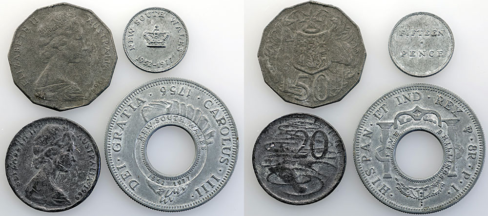 | Description: 1977 Holey Dollar and Dump commemorative restrikes in white metal and counterfeit cast forgeries 20 Cent 1969 and 50 Cent 1969. (4 items total). As Struck |