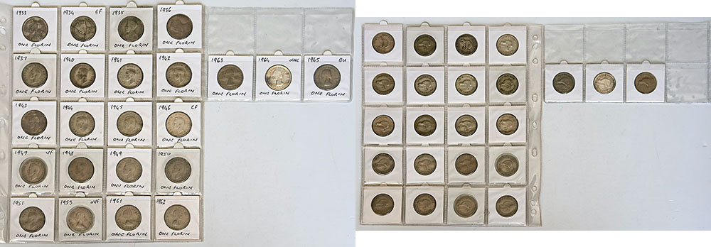 New Zealand Florin collection, 1933-1965, complete. Mostly toned, some of the early dates cleaned. (23 coins total).
