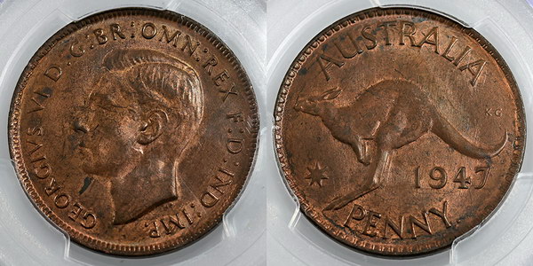1947Y. PCGS graded MS 63 BN (26347769). Mint red and brown lustre. Scarce.