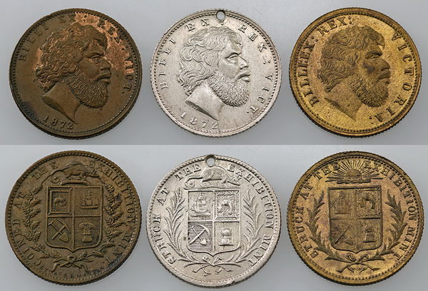 | Description: 1872 Victoria Exhibition medallions, Billi Ex Rex issues: 1872/1 in bronze with die crack, scratch and stain (EF), 1872/2 in white metal, holed (gVF) and undated in brass (gEF). Struck at the exhibition mint. (3 medallions total). gVF-gEF |