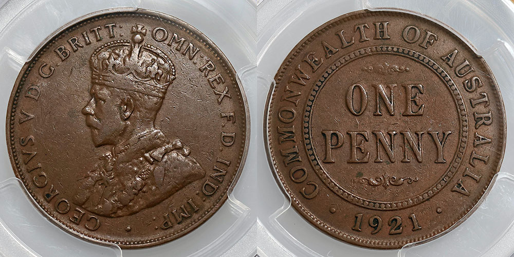 1921. English Obverse. PCGS graded VF 30 (84052990). Brown with six pearls, Obverse scratch.