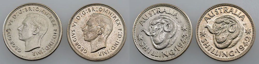 Shilling. 1942S, 1944S. Also Threepence 1934...