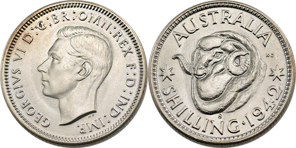 Shilling. 1942S, 1944S. Also Threepence 1934...