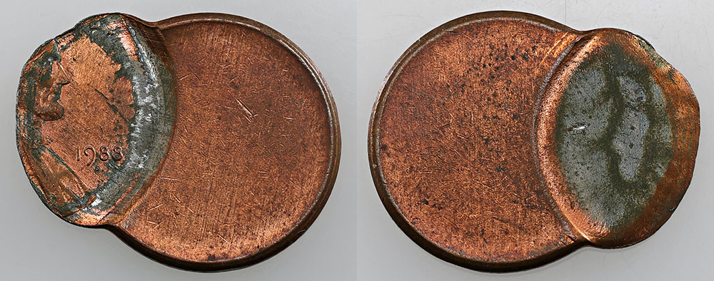 United States 1 Cent 1988. Struck massively (75%) off-centre, with obscure brockage Reverse. Mostly red.
