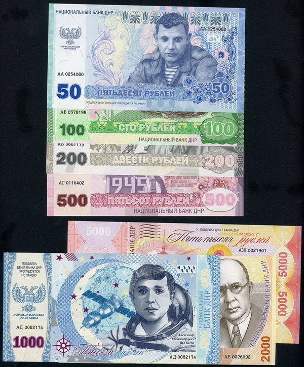 Ukraine, Russian Occupation Donetsk Peoples Republic (DPR) set of 7 fantasy notes 2018, 50 to 5000 Rubles. (7 notes total).