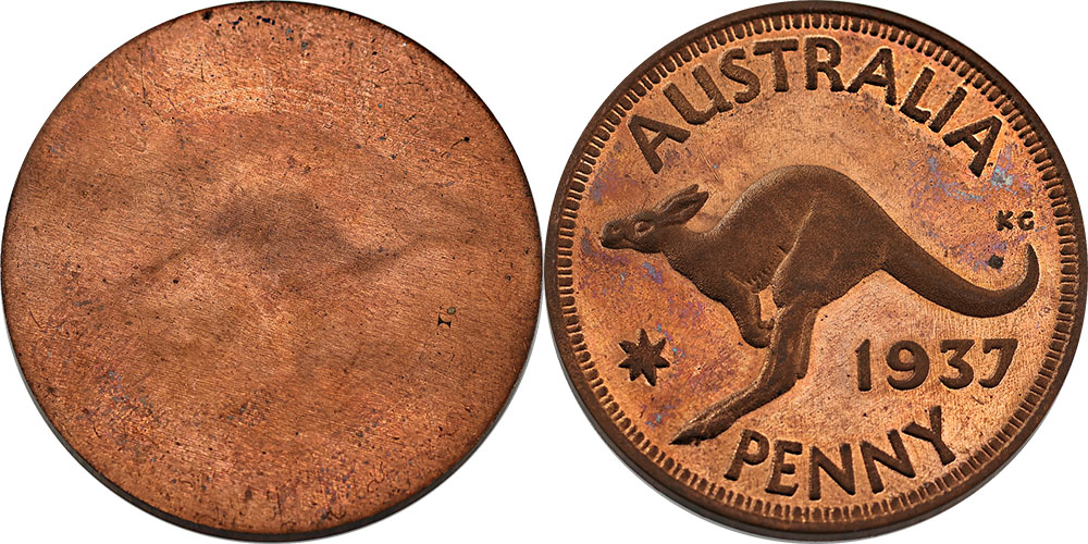 1937 Penny Reverse uniface Pattern. Struck in copper by notorious forger David Gee. Mostly red. Rare.