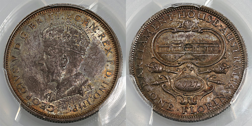 1927 Canberra. PCGS graded MS 63 (56919517). Dark old toned with underlying golden lustre.