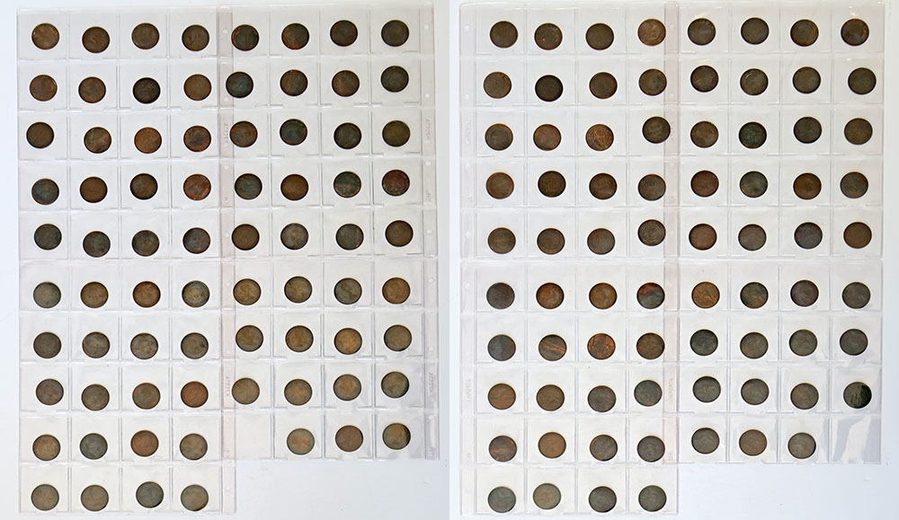 Penny date set, 1911-1964, incomplete. Missing 1925, 1930, 1946. Some cleaned. In sheets. (75 coins total).
