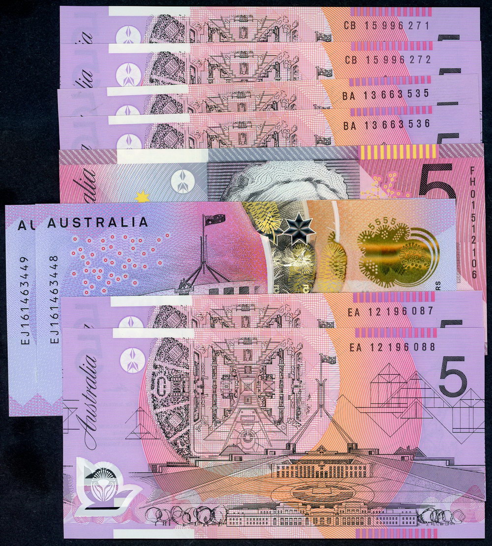 | Description: 2012 polymer Stevens-Parkinson EA 12 (R 222aL) consecutive pair, 2016 Wattle Stevens-Fraser EJ 16 (R 224L) consecutive pair. Also First Year Prefix Stevens-Parkinson BA 13 (R 222bF) consecutive pair and standard issues 2001 Federation (R 219), 2015 Stevens-Fraser (R 223) consecutive pair. (9 notes total). UNC |