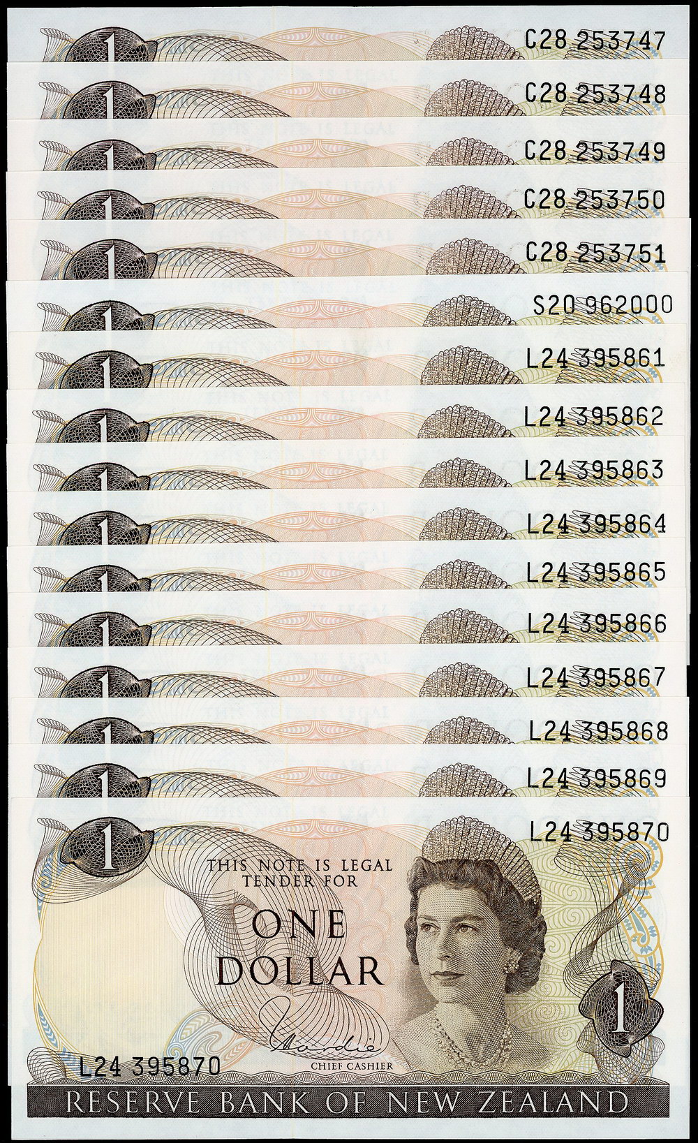 New Zealand 1 Dollar N/D Knight (1975-77) (P 163c) consecutive run of 5, N/D Hardie (1977-81) (P 163d) flick. Consecutive run of 10 and a single. (16 notes total).