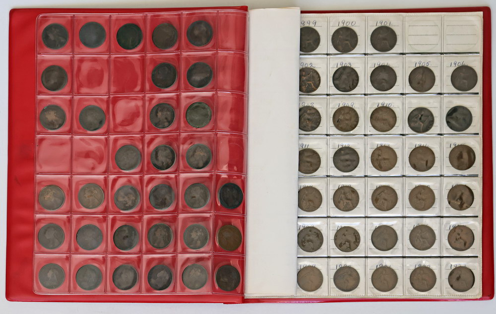 Halfpenny collection 1860-1967, mostly complete (92 coins), along with a few extras, GB Pennies (18) and NZ Pennies (8). In old coin album. (118 coins total).