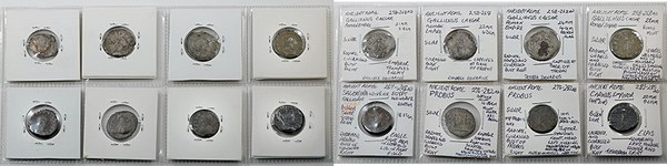 | Description: Ancient Rome Imperial billon silver Gallienus Antoninianus, assorted varieties (258-268AD); Trampling Enemy, Captives (2; one fractured), Virtus Reverses; Salonina (wife of Gallienus) (267-268AD), bust/eagle, Probus (276-282AD) bust/standing facing Jupiter, and Carinus tetradrachm (283-285AD) bust/Elpis. Most toned, some pitted. (8 coins total). G-VG |