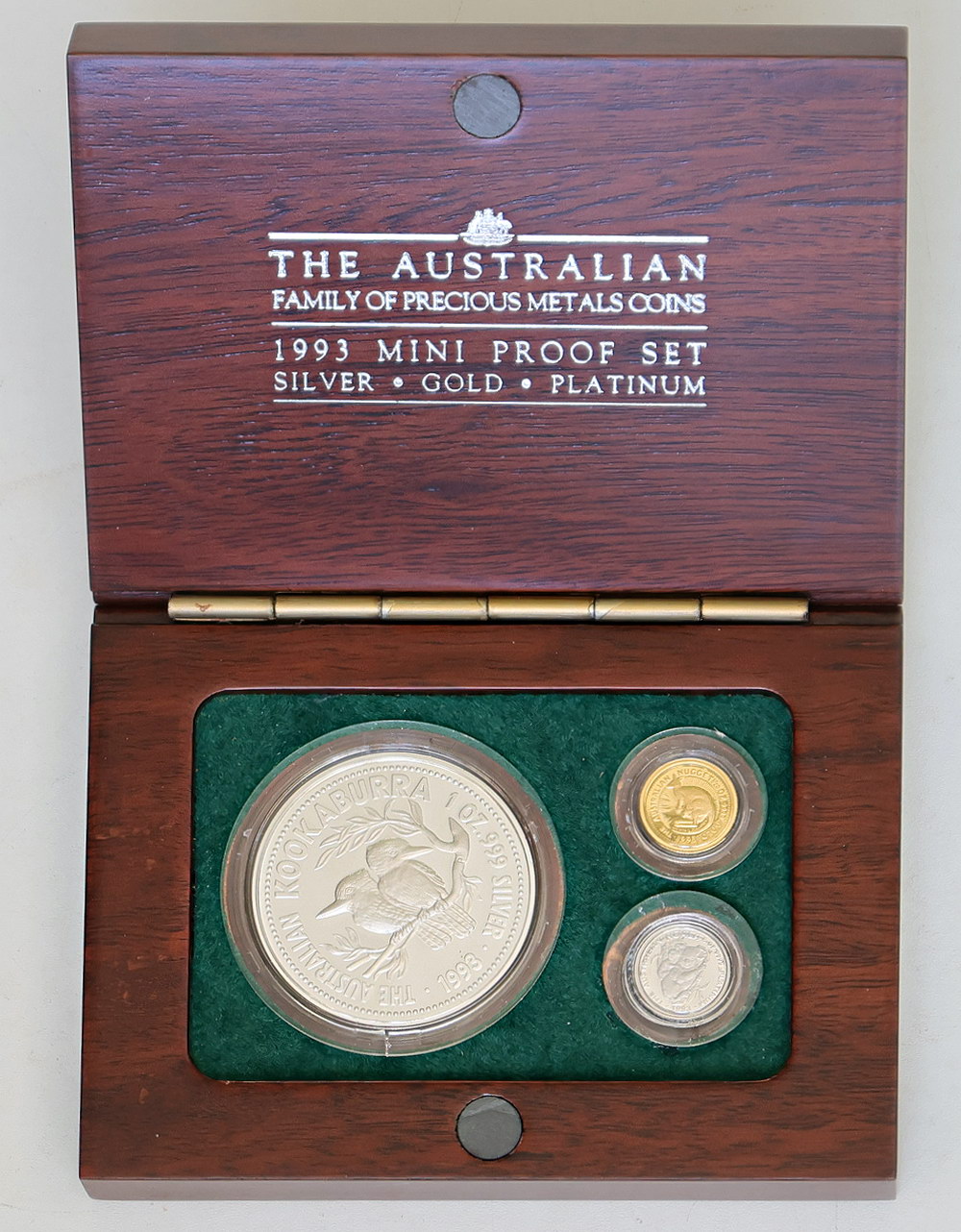 | Description: 1993 Australian Family of Precious Metals mini Proof set. Contains gold 1/20th oz Proof Kangaroo, platinum 1/20th oz Proof Koala and silver 1 oz Proof Kookaburra. In jarrah box (missing COA, platinum capsule damaged). FDC |