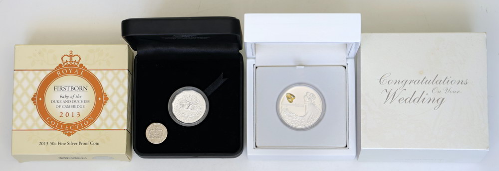 | Description: 2015 Wedding Congratulations selectively gold-plated 1 oz silver Proof. Also RAM 2013 Royal Collection: First Born 50 Cent silver Proof (damage to inner case). In boxes of issue with COA. (2 items total). FDC |