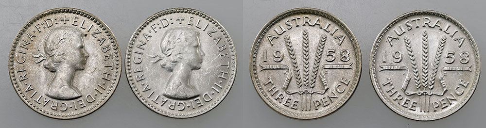 Threepence. 1957, 1958. Light tone with bloom....