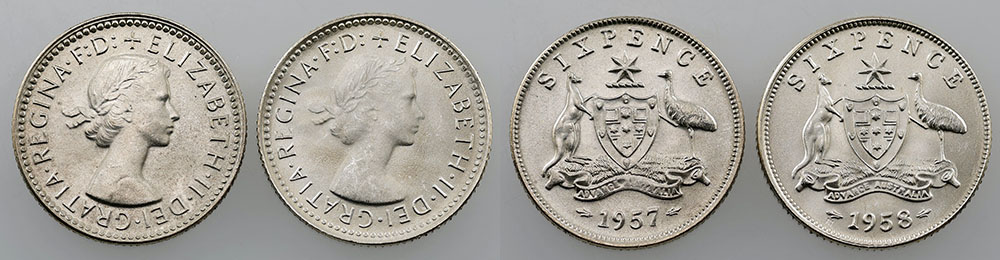 Sixpence. 1958. Light tone with bloom. (2 coins...
